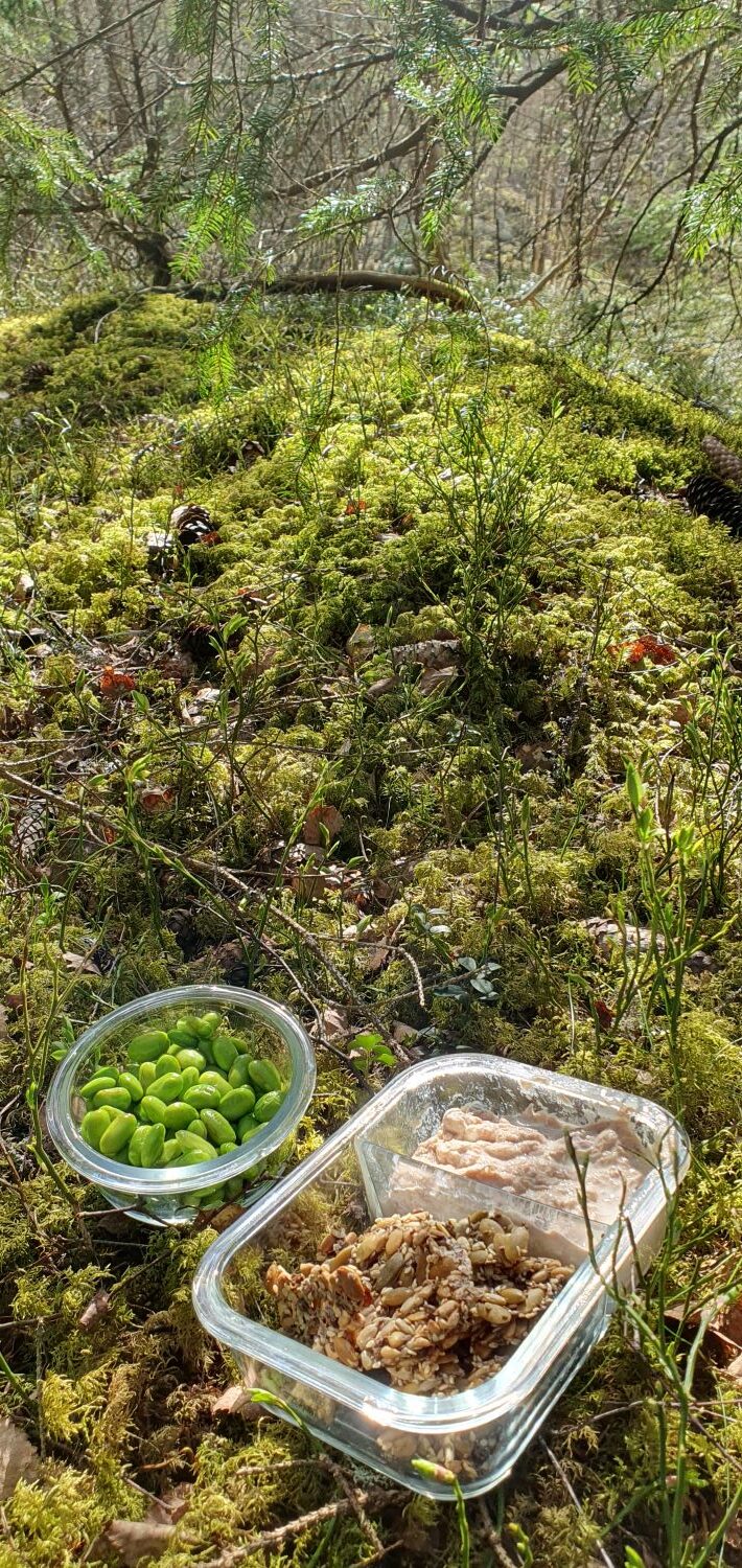 There was only one full blown proper sit down, 15 min long. It was around noon, at approx 50K. I needed to eat a full lunch, and there was a stone in the middle of the forest, illuminated by sunlight smiling through the pine tree branches.