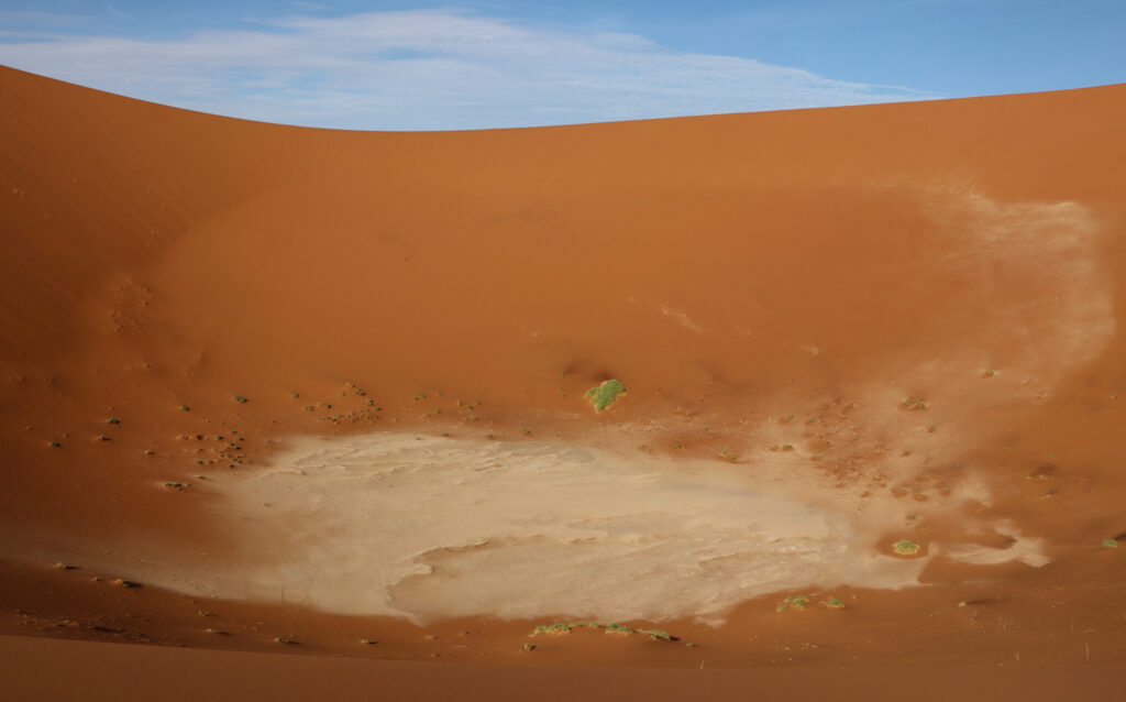 Sossusvlei refers to a salt and clay pan surrounded by towering red sand dunes. These dunes are some of the tallest in the world, with some reaching heights of over 300 meters. The pan itself only fills with water in rare years when the Tsauchab River floods. Most of the time, it is dry, cracked, and white, creating a dramatic contrast against the red dunes.