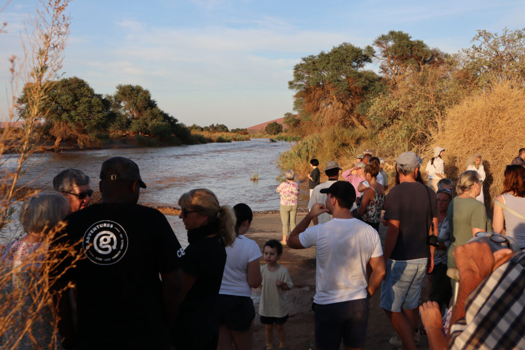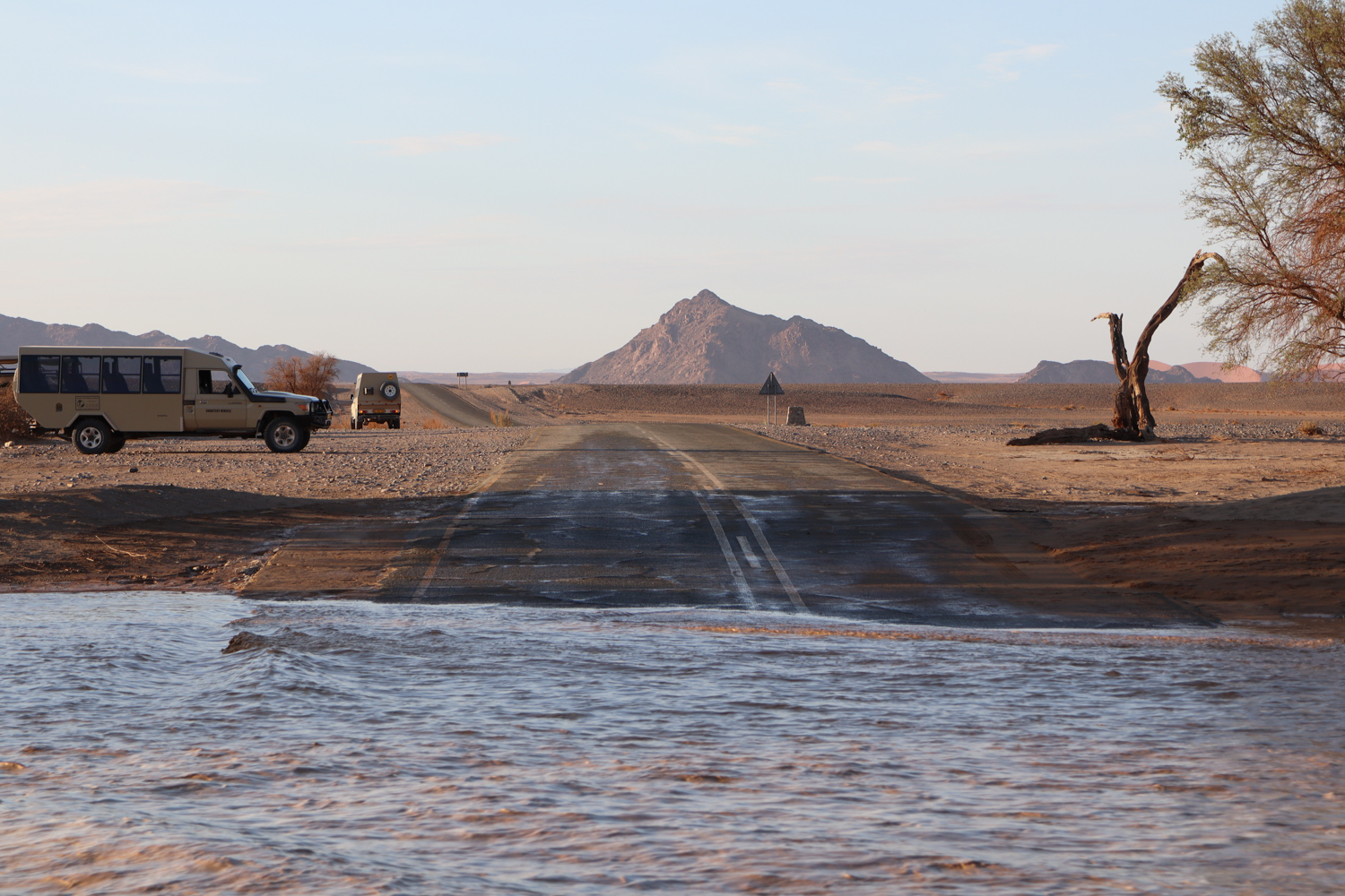Soon after we passed the gates we were forced to stop on the bank of the Tsauchab river, and to wait for the flood to ease up, as we were supposed to cross the riverbed at this point. This made the entire day shift quite a lot; the schedule for hiking dunes was delayed. Its effect will be very noticeable later, on several occasions.
