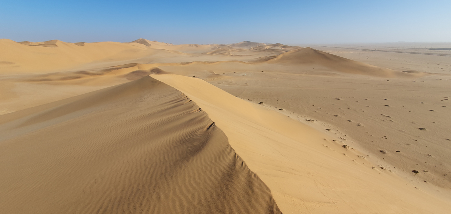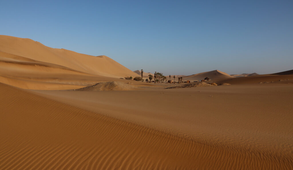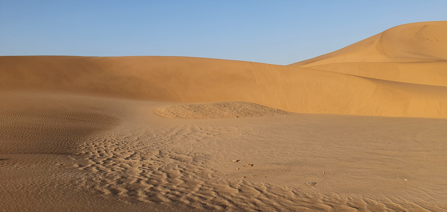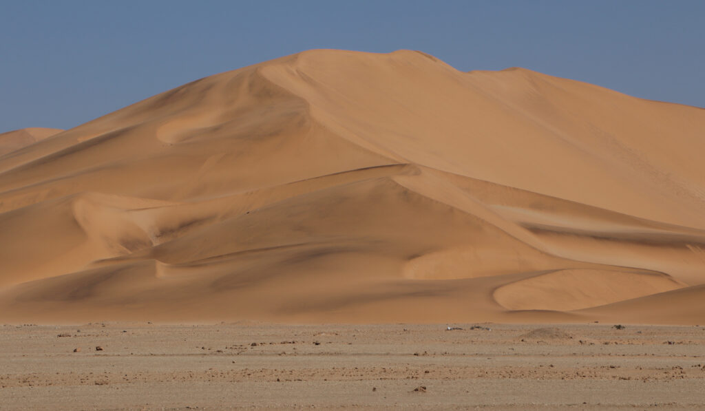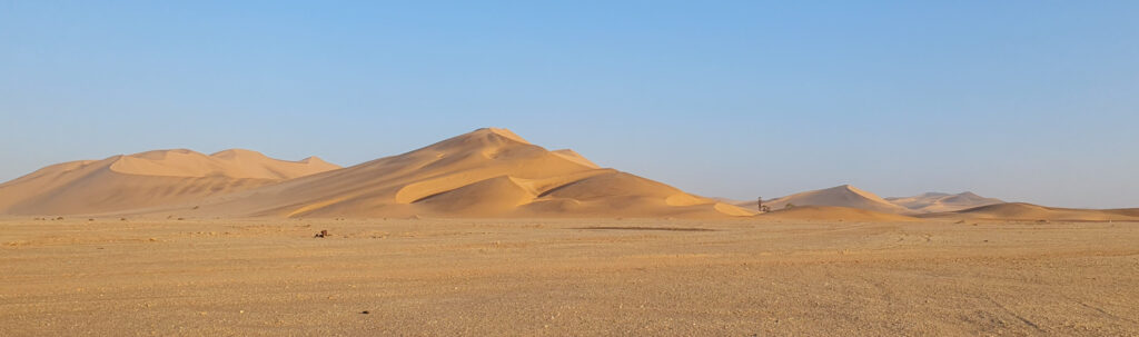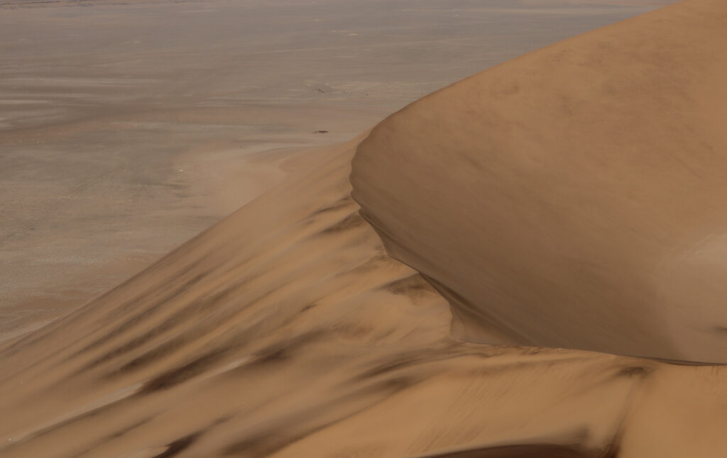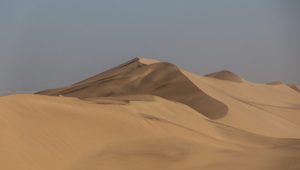 The name “Dune 7” originates from its position as the seventh dune encountered after crossing the Tsauchab River, according to early survey maps. The dune is classified as a star dune due to its radial symmetry and multiple slip faces.Its composition is primarily quartz sand with a high iron oxide content, which gives the sand a reddish-orange hue. The sand originated from weathered rock in the interior of southern Africa and was transported westward by the Orange River and wind activity. Due to this activity, Dune 7 is in a state of dynamic equilibrium – constantly shifting but maintaining its general structure over time. The color and reflectance of the sand vary with solar angle, giving the dune different appearances throughout the day. In the early morning and late afternoon, low-angle light produces high contrast in dune features, enhancing visibility of ripples and slip faces.