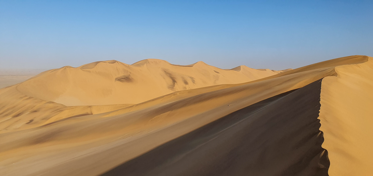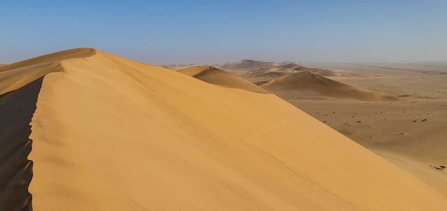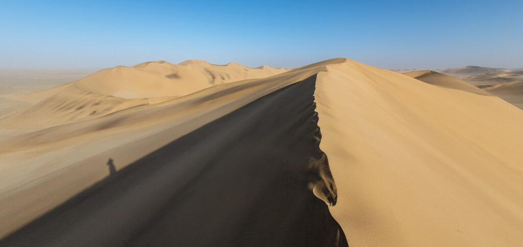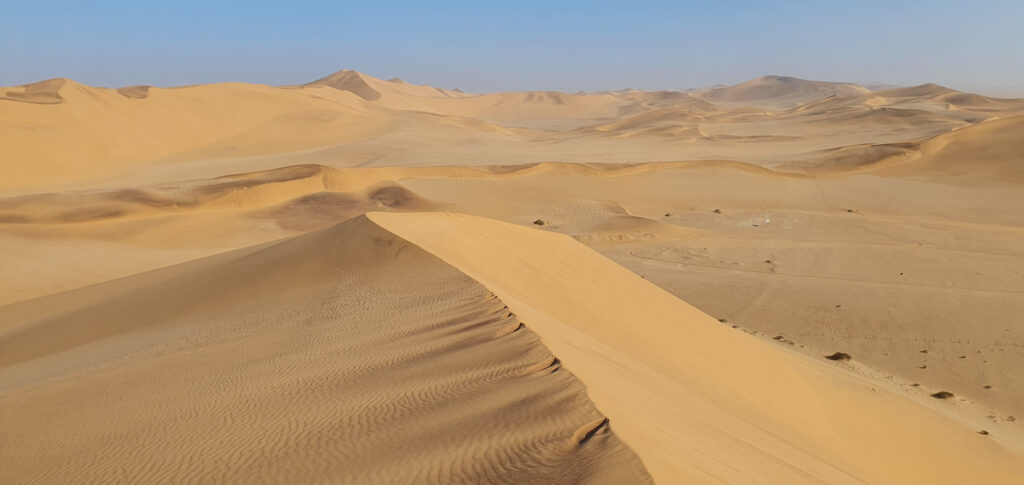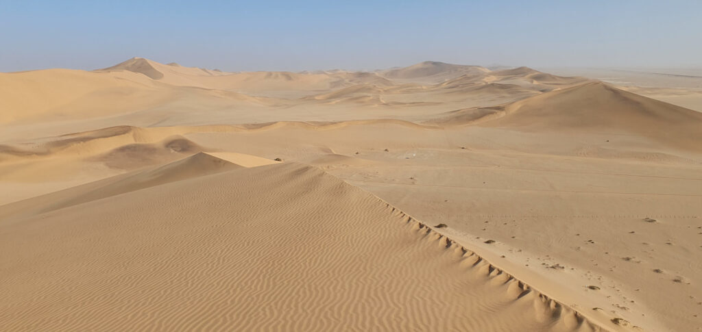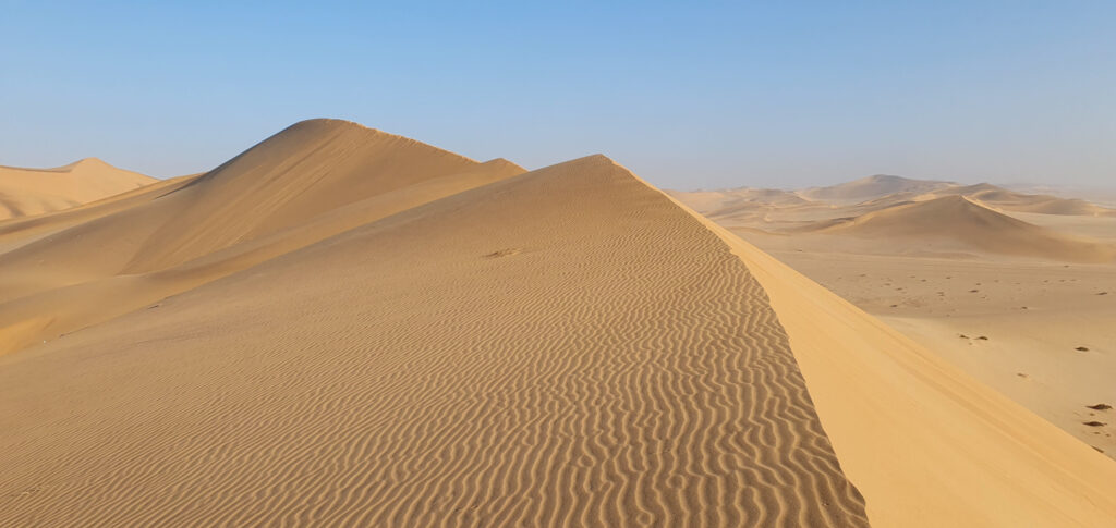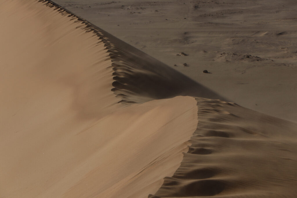 I really took time to enjoy it. The climb to the top was superb and it took me approx 20-25 min. It was warm but the wind was blowing from every direction at every second. The steeper parts demanded that I crawl on my knees along the ridges, with my fingers dug deep into the early morning cold sand like Wolverine. The top layer of sand crumbles each time my feet penetrate it so it’s a bit challenging on the steeper parts, but reaching the flatter ones while being blown by the ocean winds heading towards the continental regions of Namibia felt like a proper blessing.