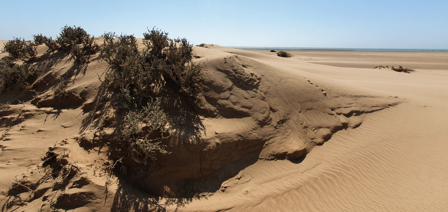 Vegetation does not grow on the dune itself due to constant sand movement and lack of water retention. The dune is part of a large erg system, with adjacent dunes interacting aerodynamically and affecting local wind patterns.