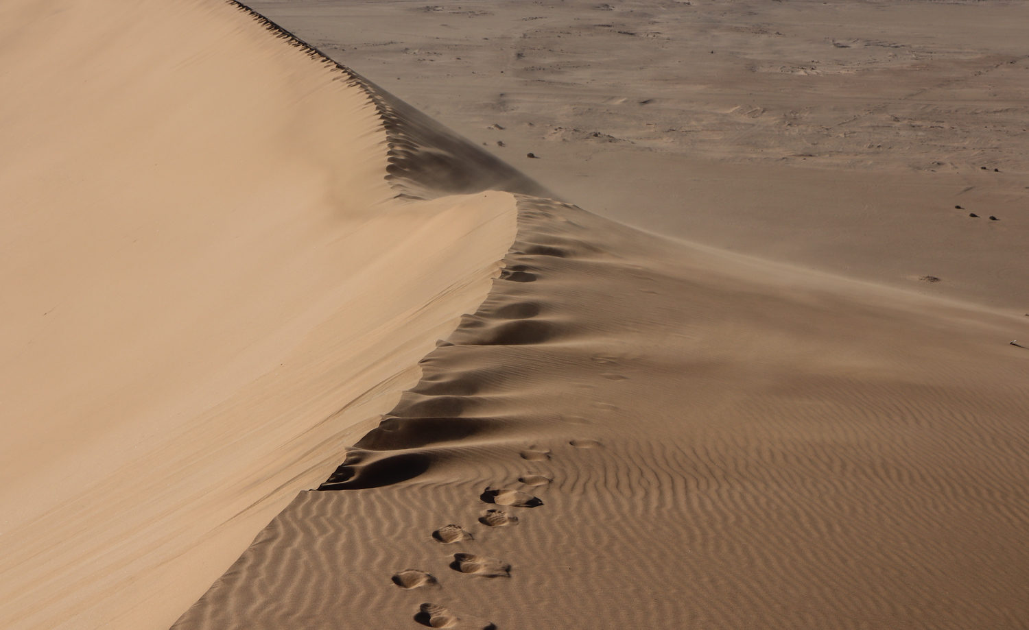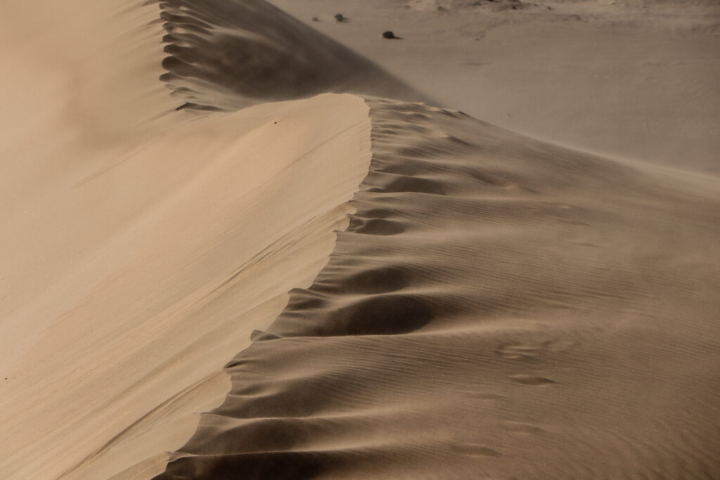 The descent from the top was not like the one usually advertised in travel blogs and YT videos. Everyone says to sit on your behind and slide down. Some use the surf lookalike boards, promising fun. For me it was intended to be meditative – I walked along the ridge several times, forwarding and backing, CRUSHED by the beauty visible from the top. It felt magical and so intense. I took time by paying attention to small creatures running across the sand which would in several hours become seemingly uninhabitable.