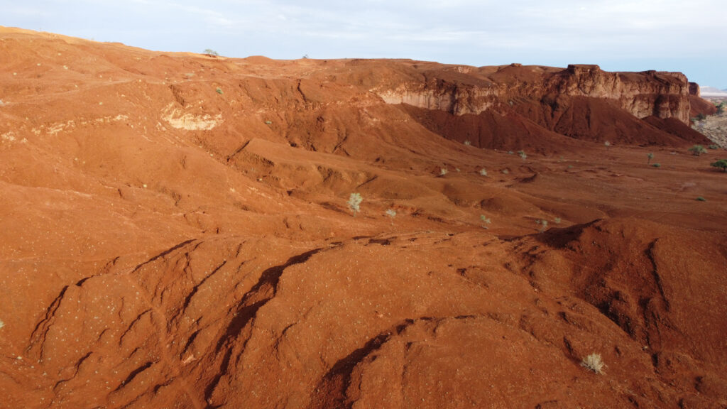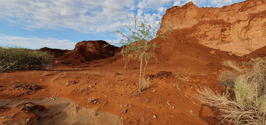 Behind the lodge lies a large stone structure painted with a deep red color, which changes to light pink tones as the Sun reaches the middle of sky. Between that stone structure and the lodge lies an ephemeral river. This type of water body appears and disappears according to the precipitations above it and the water availability. I came to explore it not long after a rainstorm, which meant that it was quite muddy at some points and I saw countless birds and small rodents drinking water.