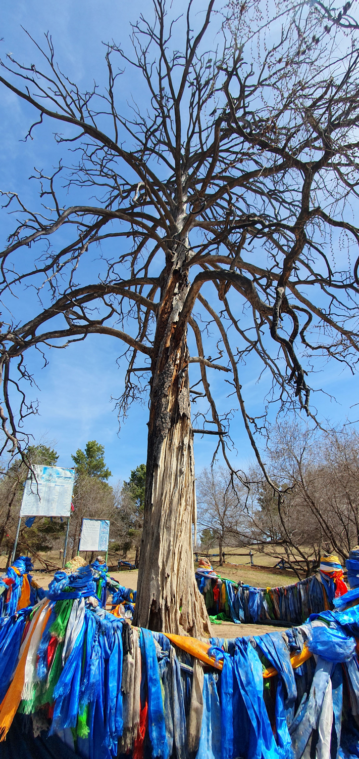 Yet the site has faced hardship. In 2015, a fire caused by incense destroyed most of the original Mother Tree, leaving only its stump. Despite the loss, devotion has not diminished. The stump remains draped in scarves and butter offerings, and nearby trees have since been elevated to sacred status. A traditional Mongolian ger stands near the shrine, continuing to anchor the site’s ritual life.