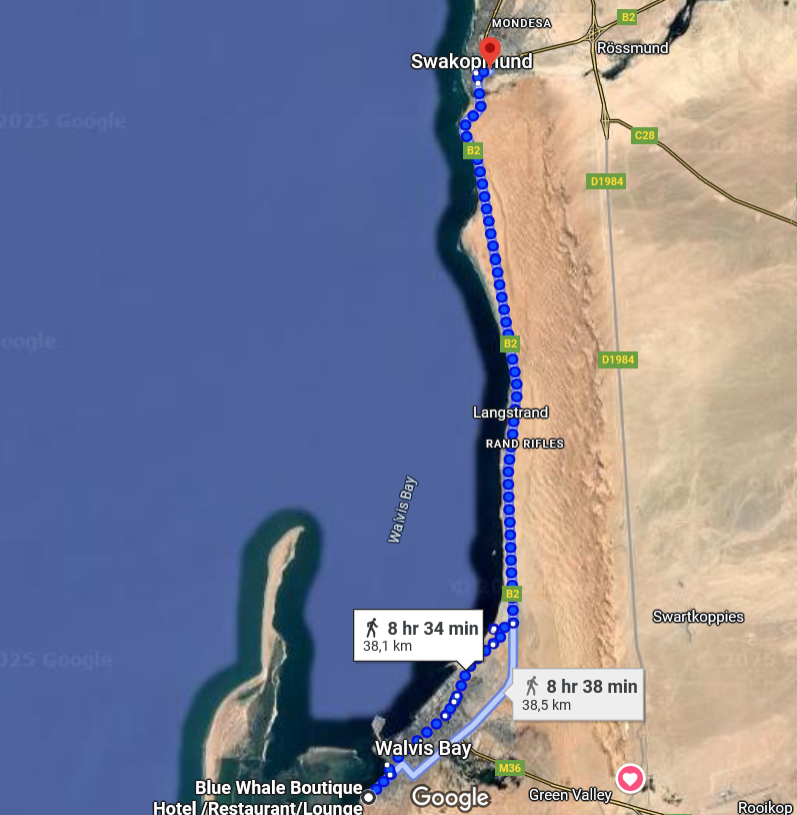 - Distance: from the Blue whale hotel in Walvis bay to the Desert sands hotel in Swakopmund – 38 km.