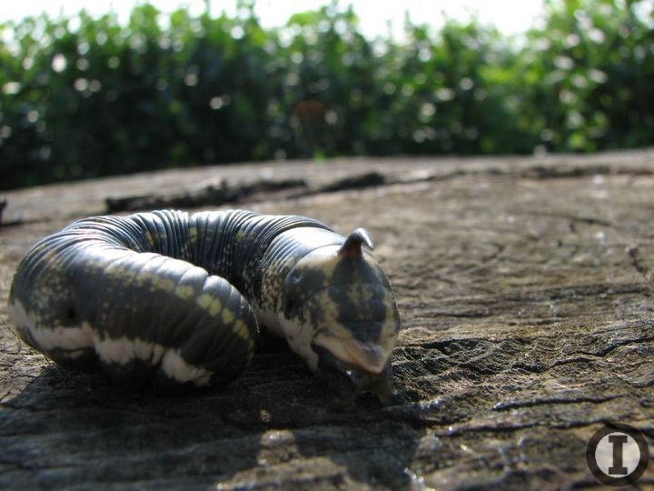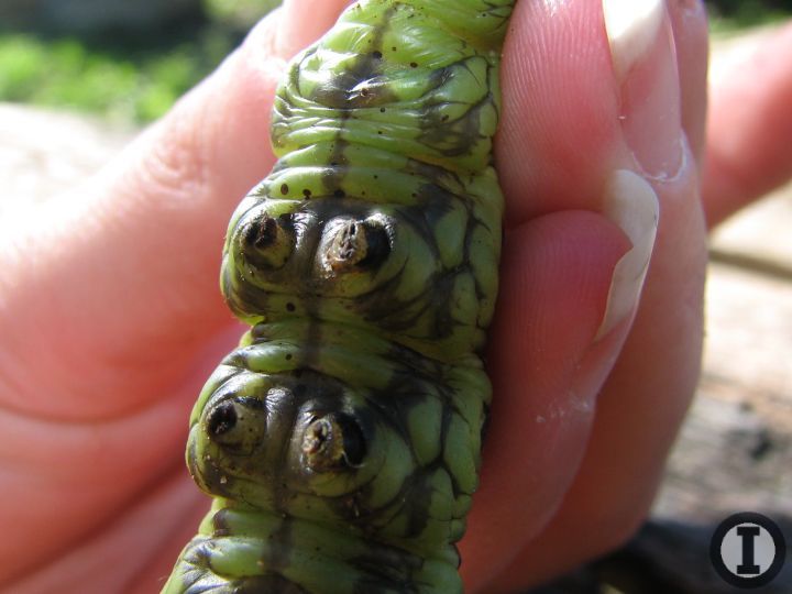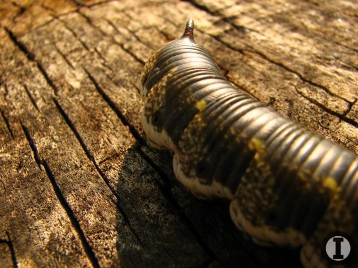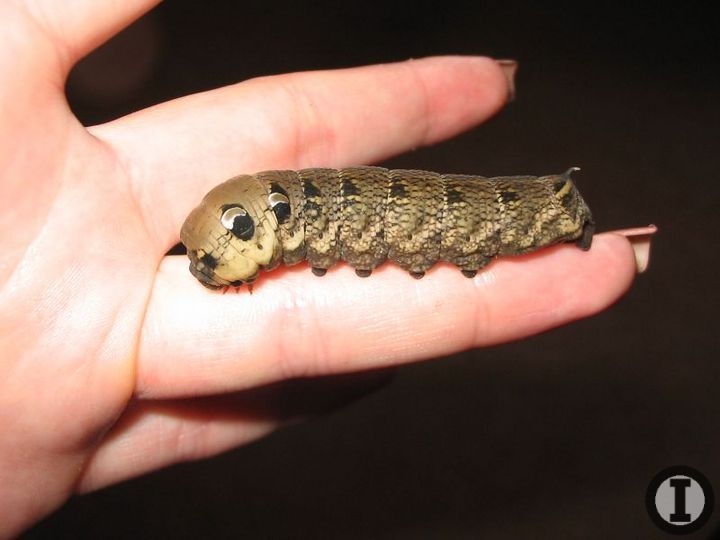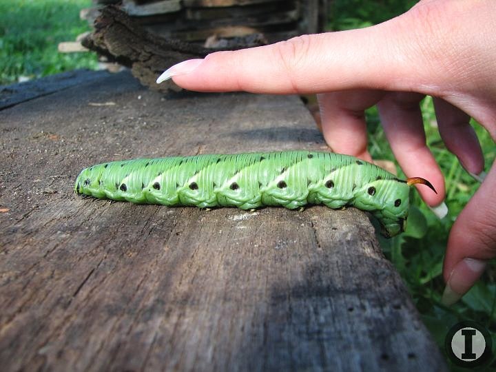 Gusjenica u zadnjem stadiju je duga 100-110mm. Polimorfna je i pojavljuje se kao zelena, smeđa i žuta. Nema dlake, na vrhu zatka je šiljak.